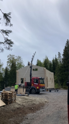 Finnlamellin hirsikuorma saapui tontille 23.5.2023. Majan pystytys alkoi 30.5.2023 ammattitimpurin toimesta.